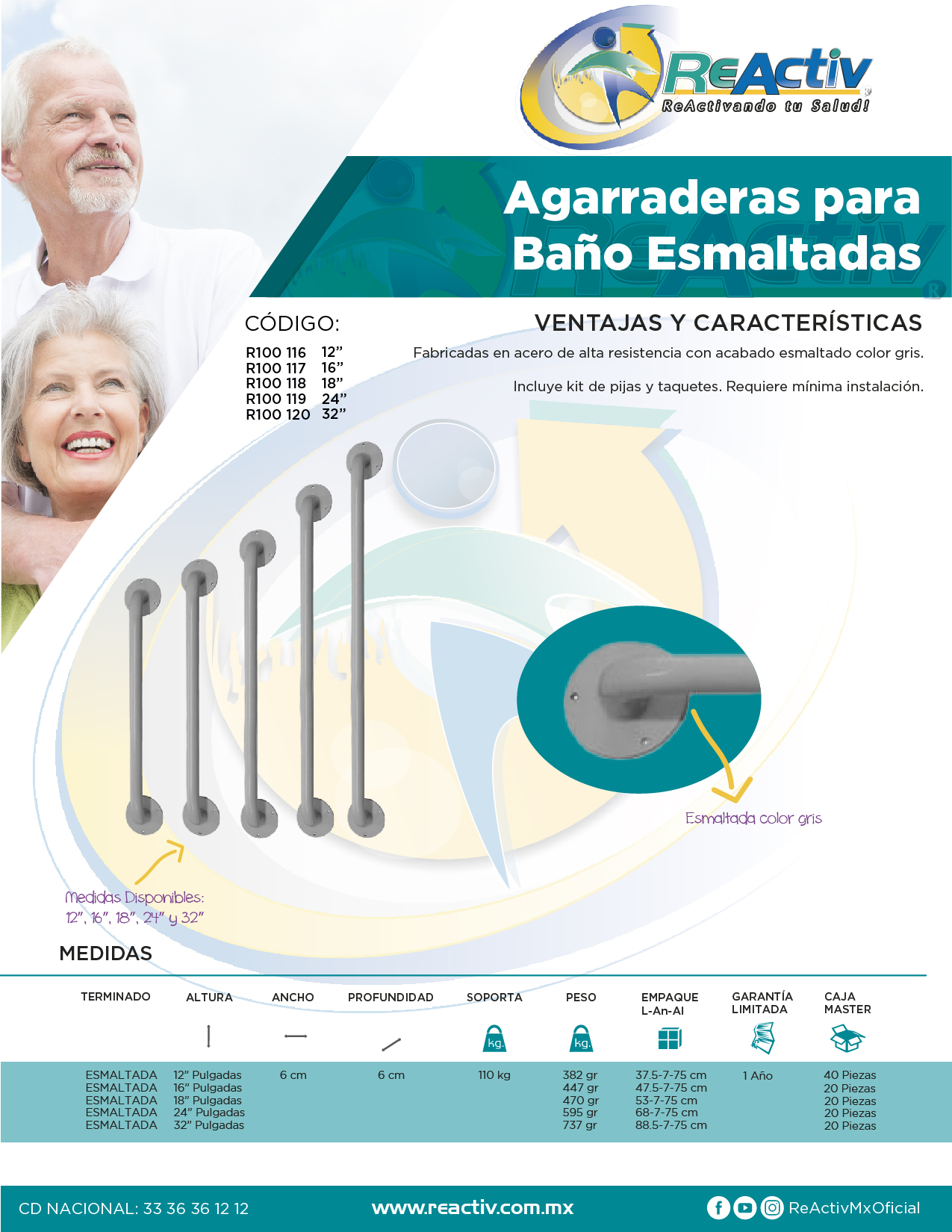 AgarraderaReActiv Industrial Recta de 18" de Acero para Baño Esmaltada