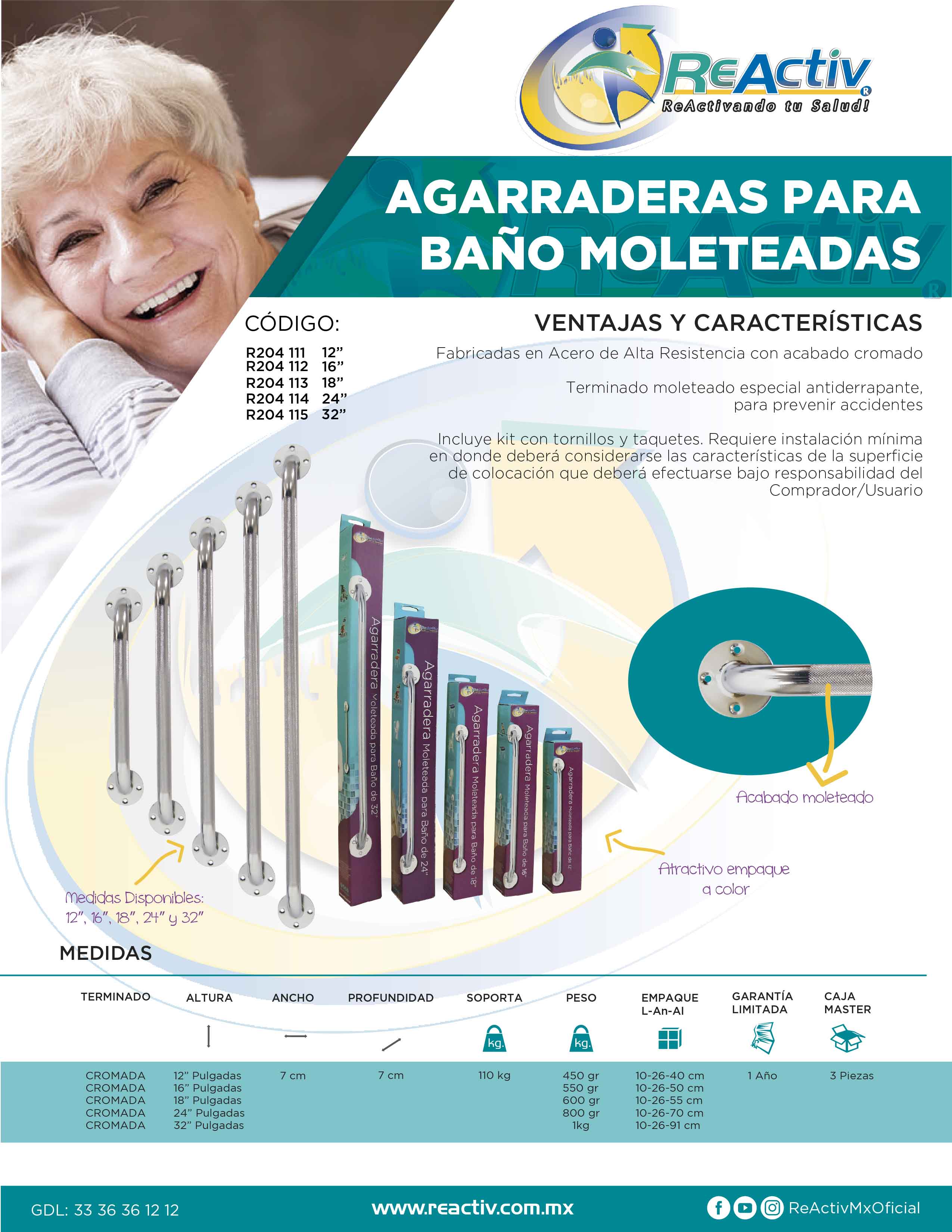 Agarradera ReActiv Recta 16" de Acero para Baño, Moleteada, Cromada