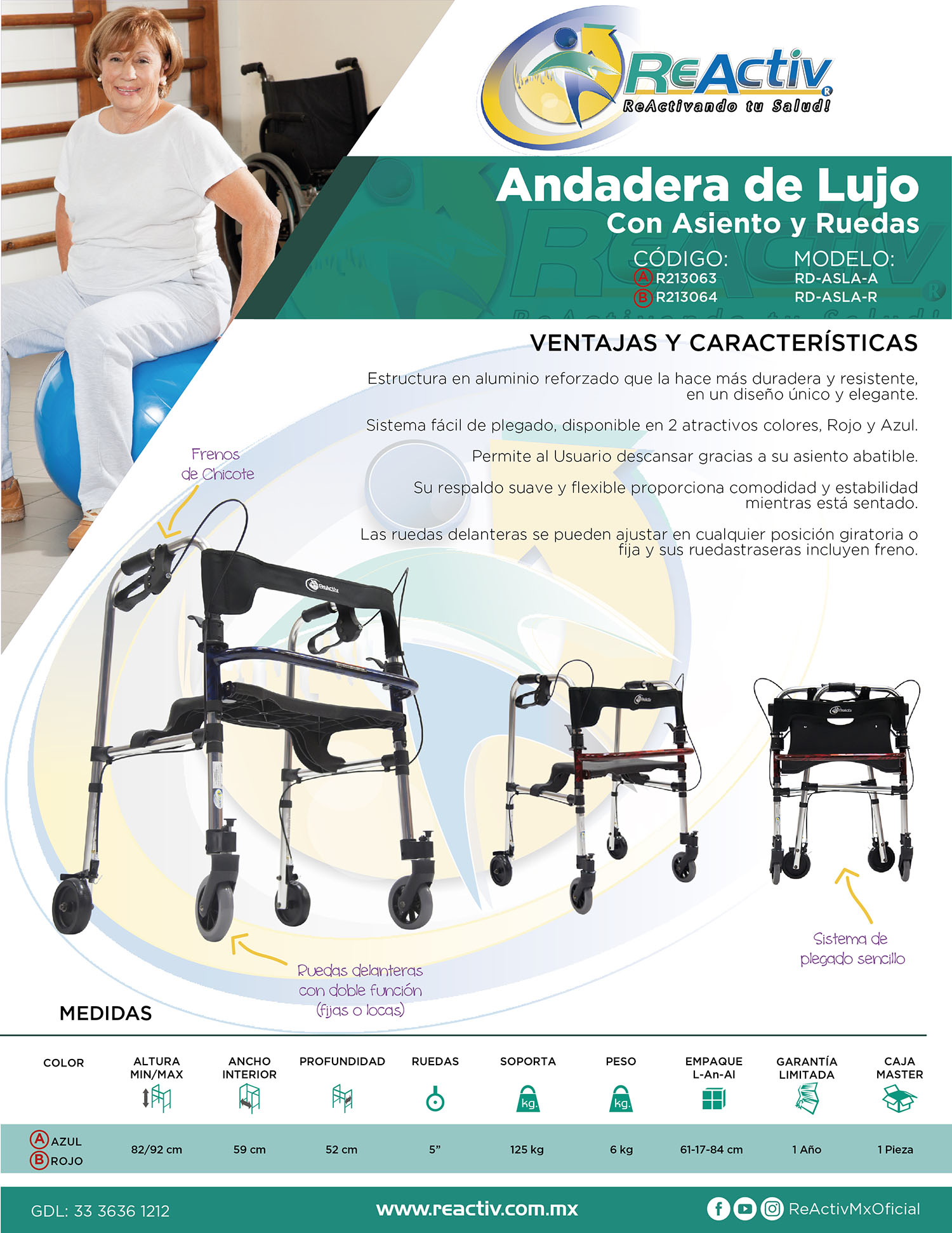 Andadera ReActiv de Aluminio de Super Lujo con Asiento y Frenos, con Ruedas de 5", Color Azul