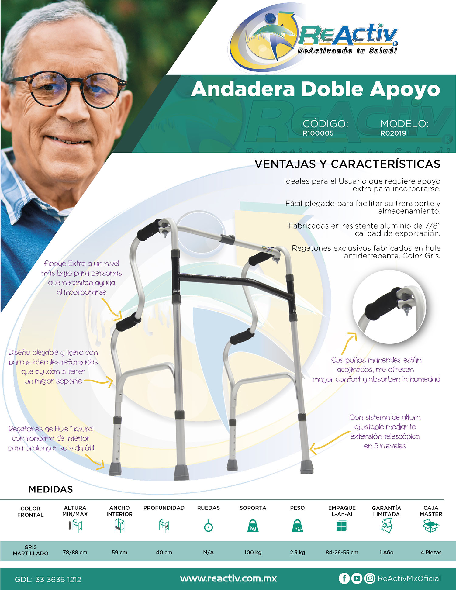 Andadera ReActiv Industrial de Aluminio Recíproca Doble Apoyo, Plegable, Gris