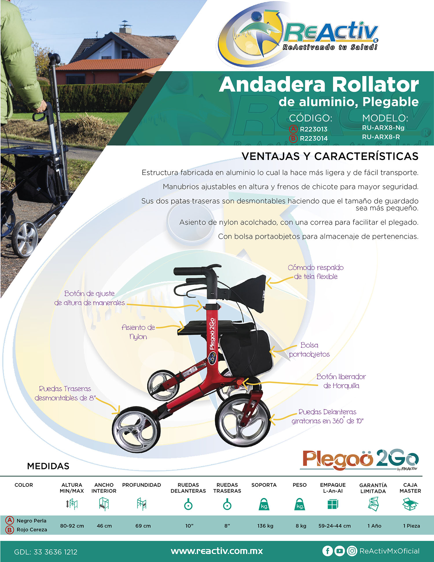 Andadera Rollator Plegoo 2Go X8 de Aluminio Plegable con Ruedas Delanteras de 10" y Traseras de 8”, Negro Perla