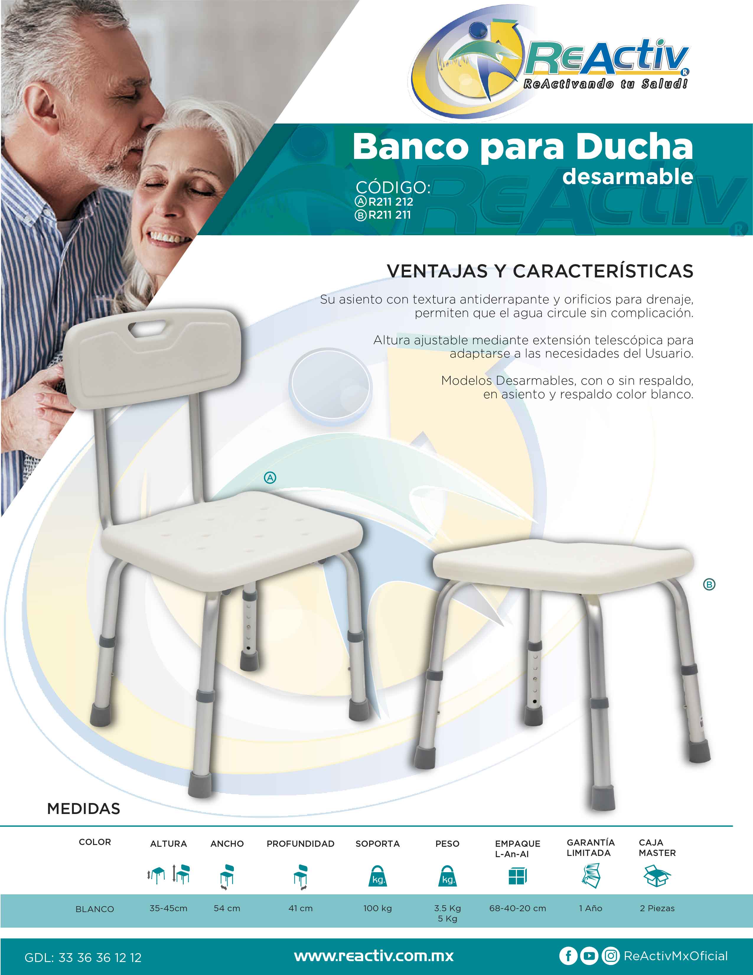 Banco para Ducha ReActiv de Aluminio sin Respaldo, Desarmable, Blanco