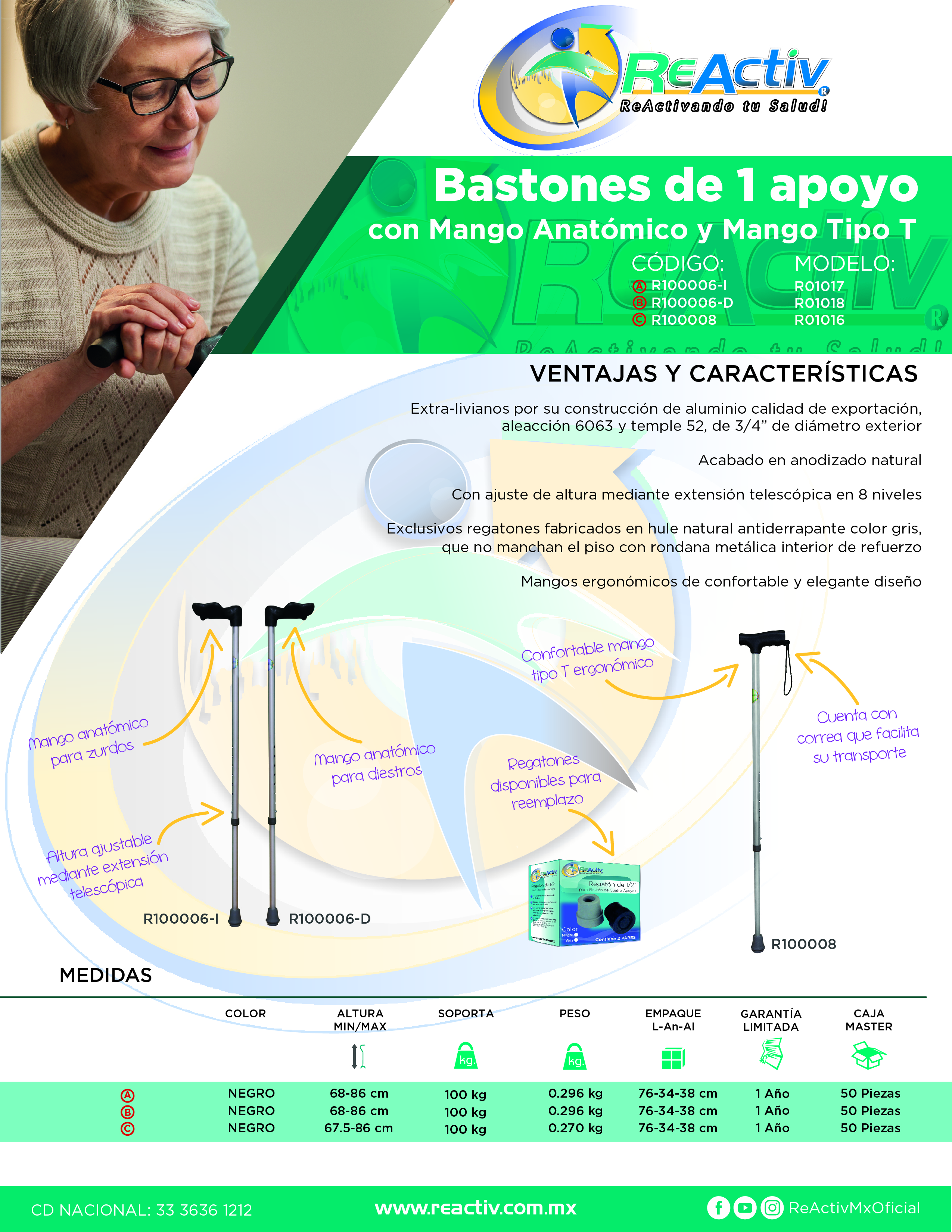 Bastón ReActiv Industrial de 1 Apoyo Mango Anatómico Mano Derecha Color Negro