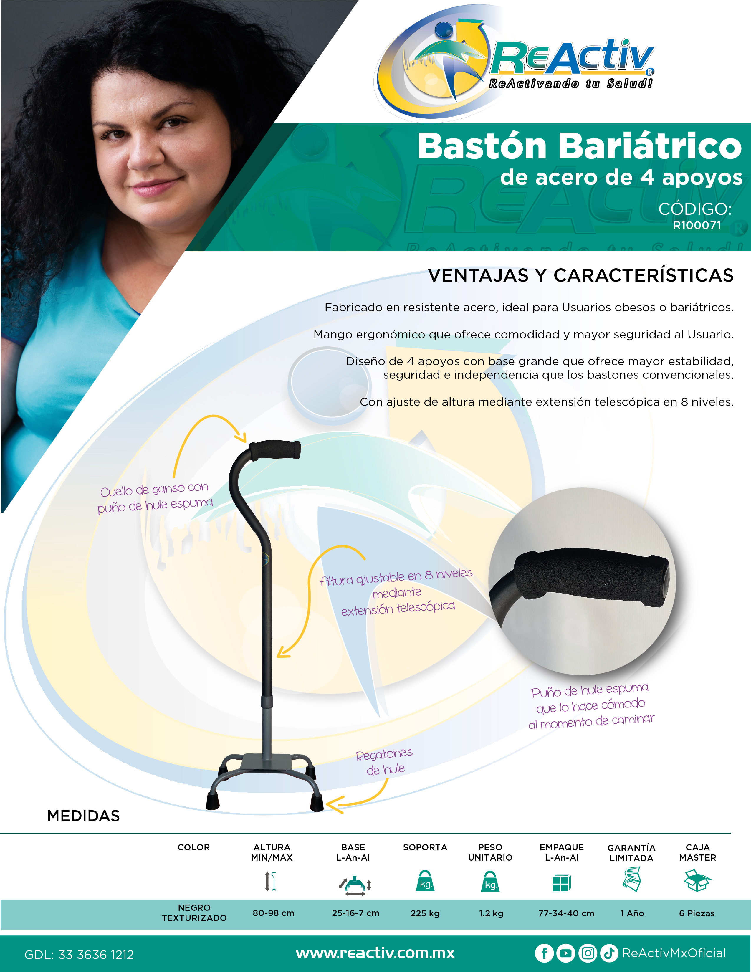 Bastón de Acero 4 Apoyos Bariátrico Base Grande Color Negro Texturizado