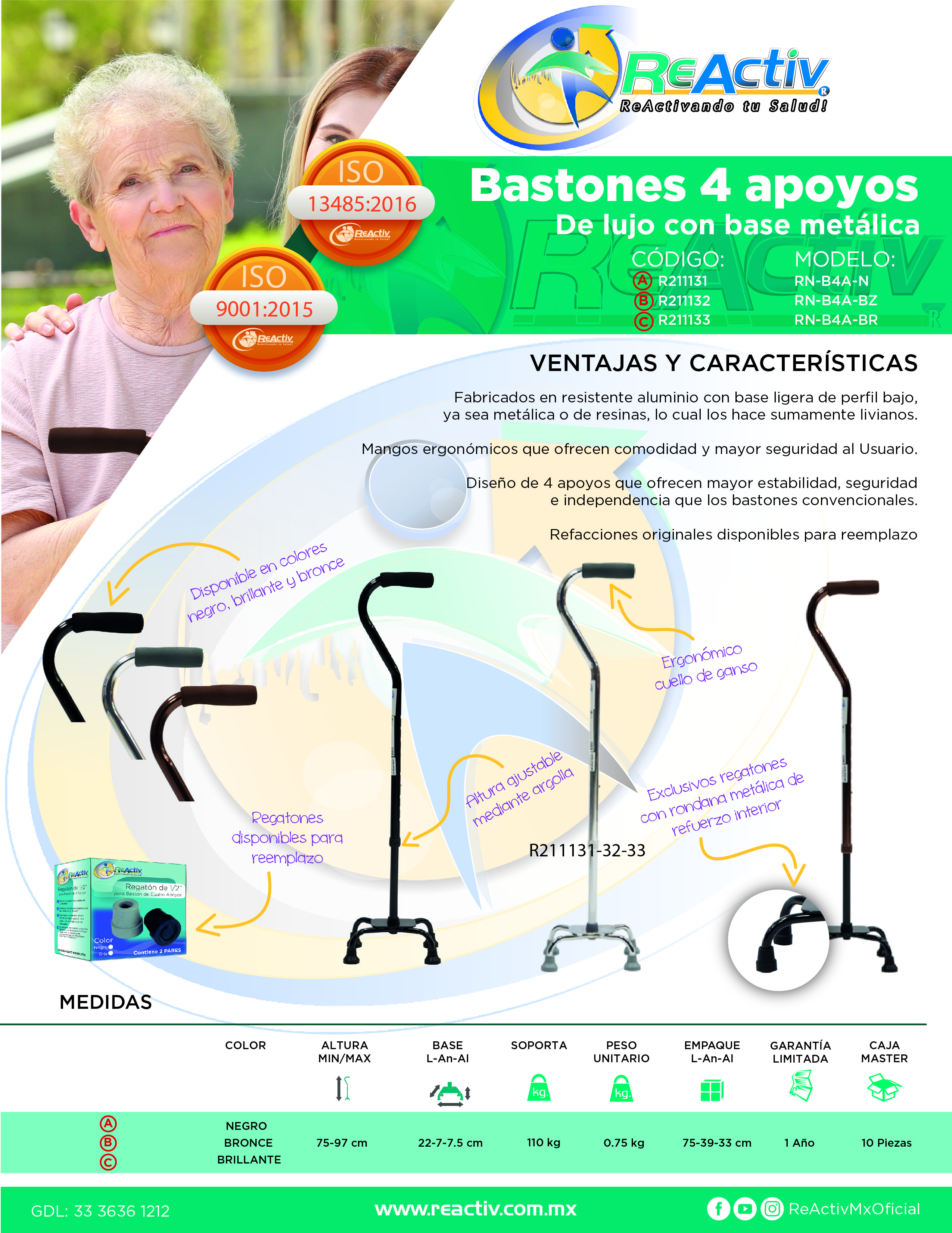 Bastón ReActiv de Aluminio de 4 Apoyos, Base Metálica, Negro