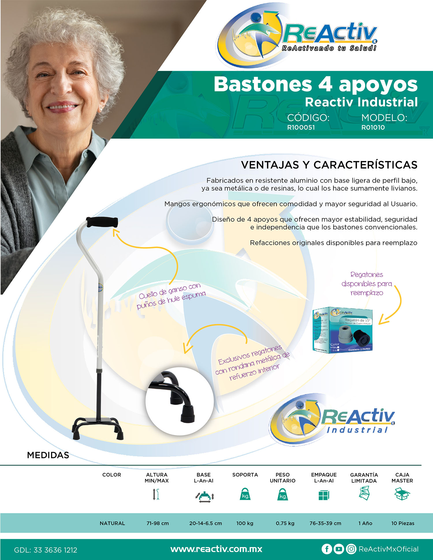 Bastón ReActiv Industrial de Aluminio de 4 Apoyos, Cuello Ganso, Base Metálica Negra