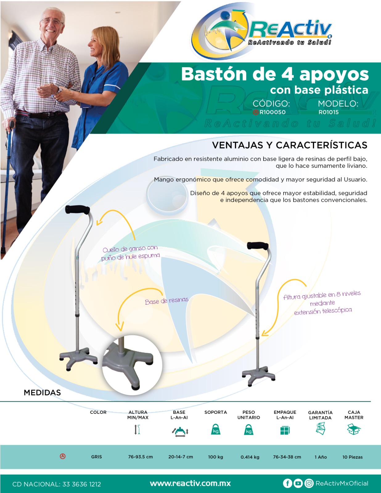 Bastón ReActiv Industrial de Aluminio, de 4 Apoyos, Mango Cuello de Ganso Base Plástica Negra