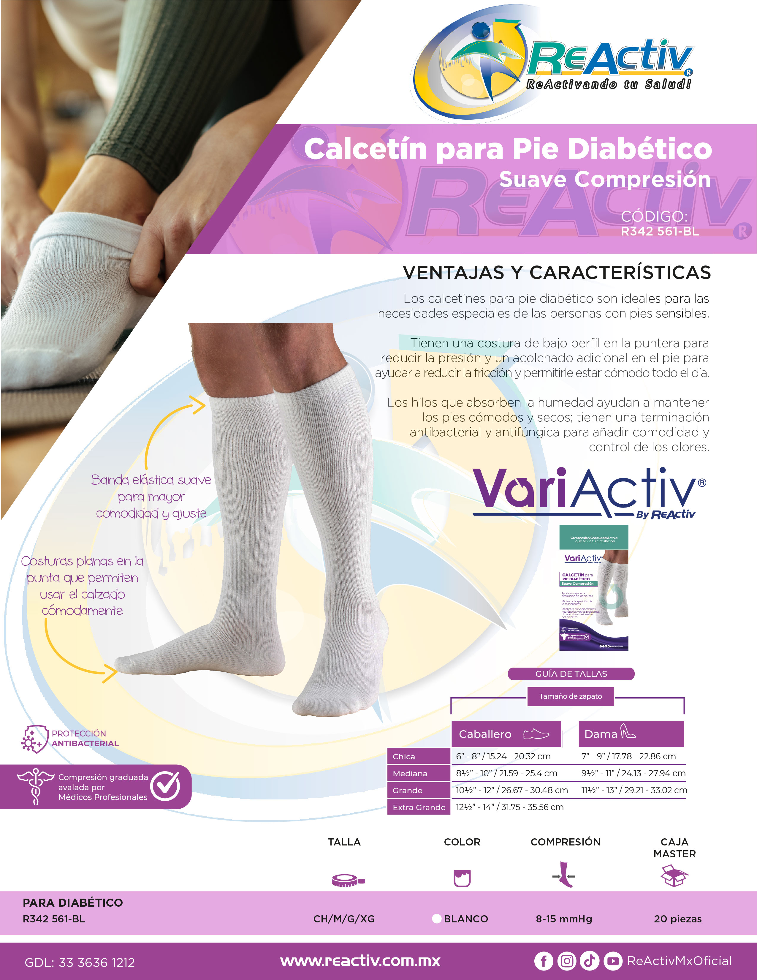 Calcetín para Pie Diabético a la Rodilla Suave Compresión 8-15 mmHg Color Blanco, Ch