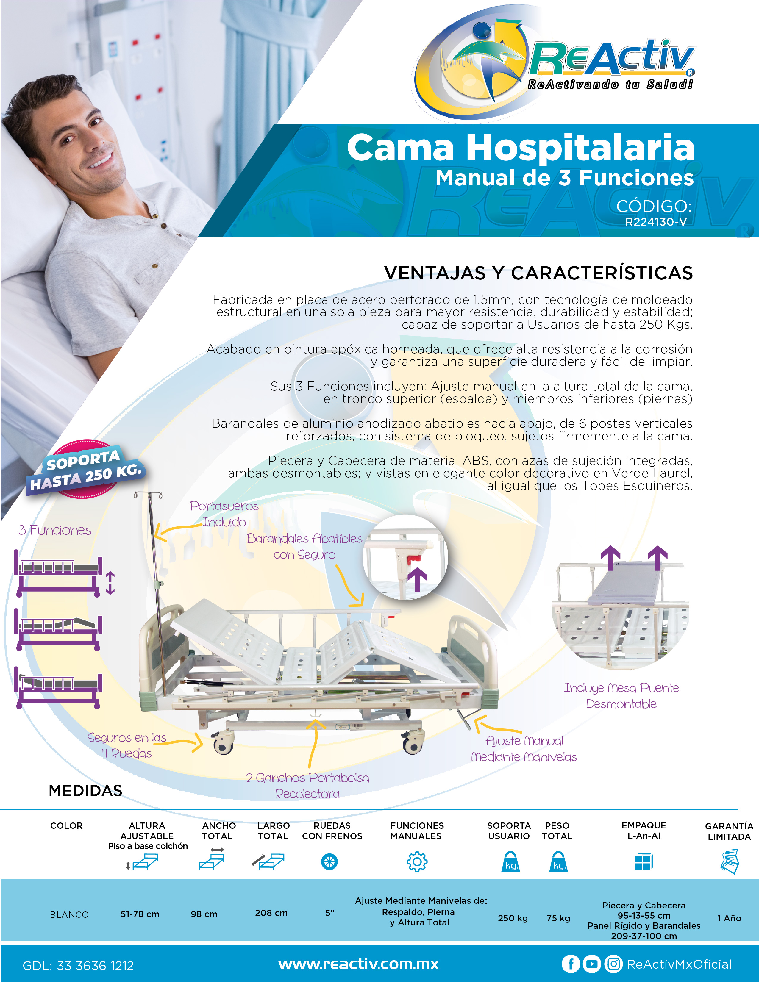 Cama Manual ReActiv de 3 Funciones con Manivelas, Piecera y Cabecera de ABS, Barandales de Aluminio Abatibles de 6 Barras, Ruedas de 125mm todas c/Freno, Incluye Porta Suero, Mesa Puente y Gancho p/Bolsa Fluidos. Capacidad de Carga 250kg.