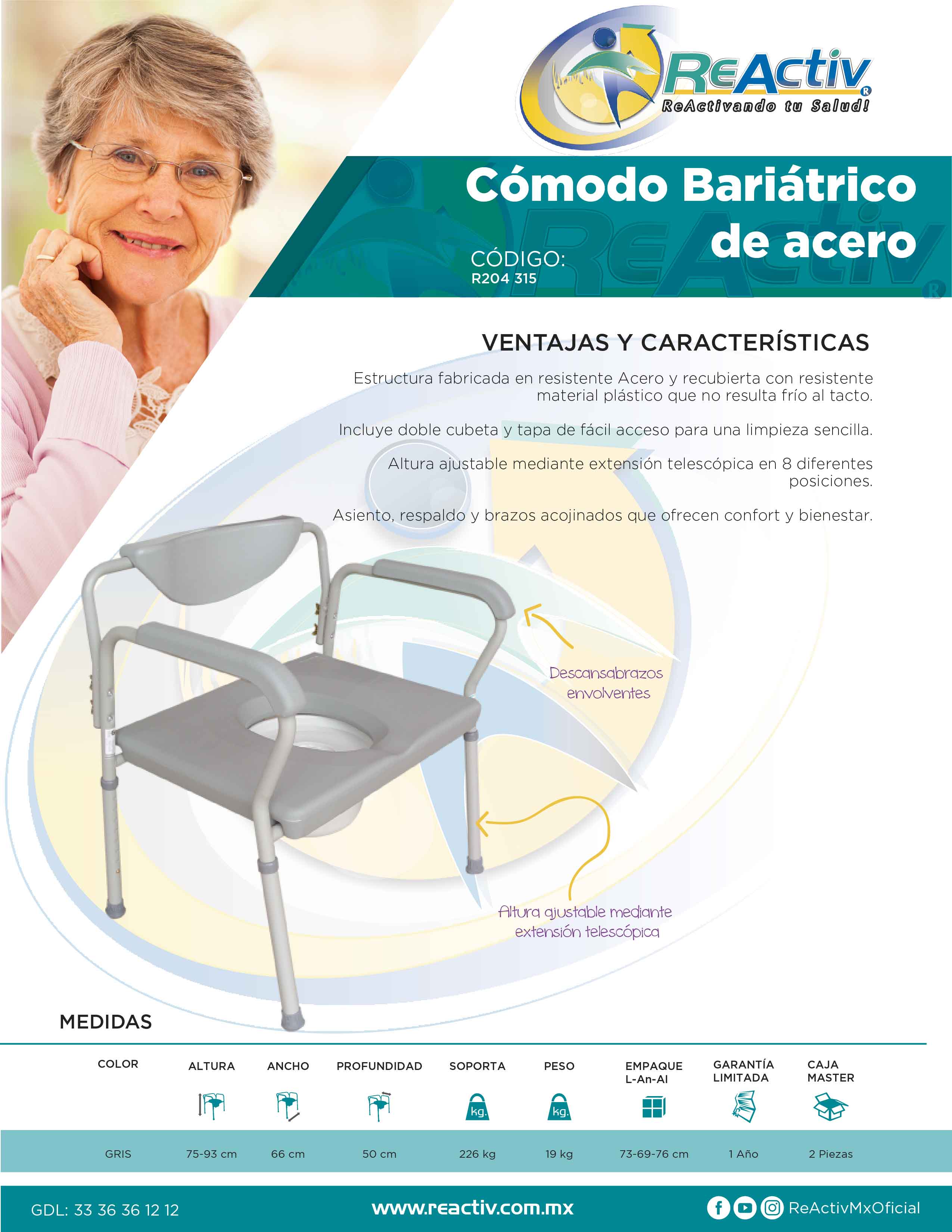 Cómodo ReActiv de Acero, Bariátrico, Extra-Ancho, con Respaldo Acojinado, Gris