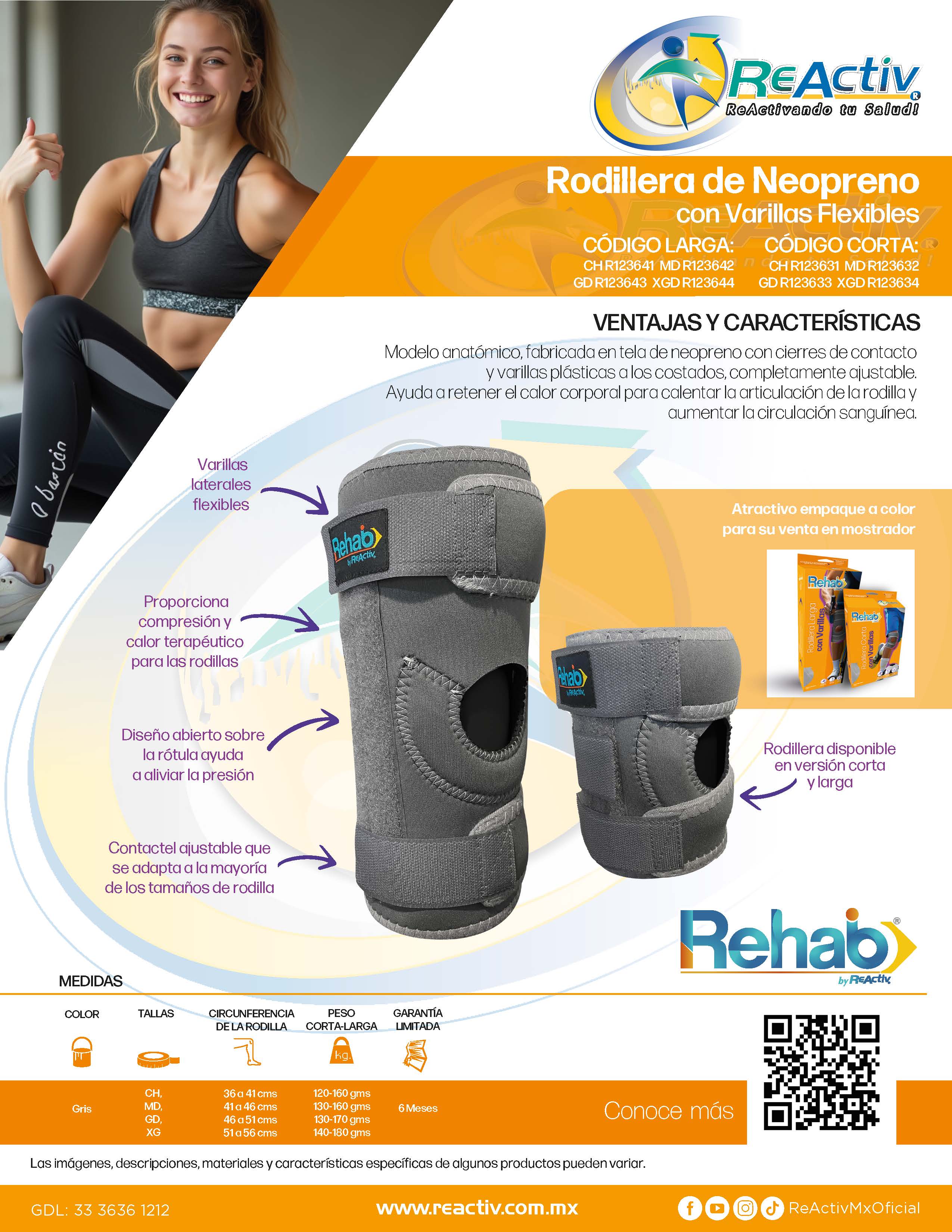 Rodillera Corta de Neopreno con Varillas Flexibles y Broche de Contactel Rehab, Xgd