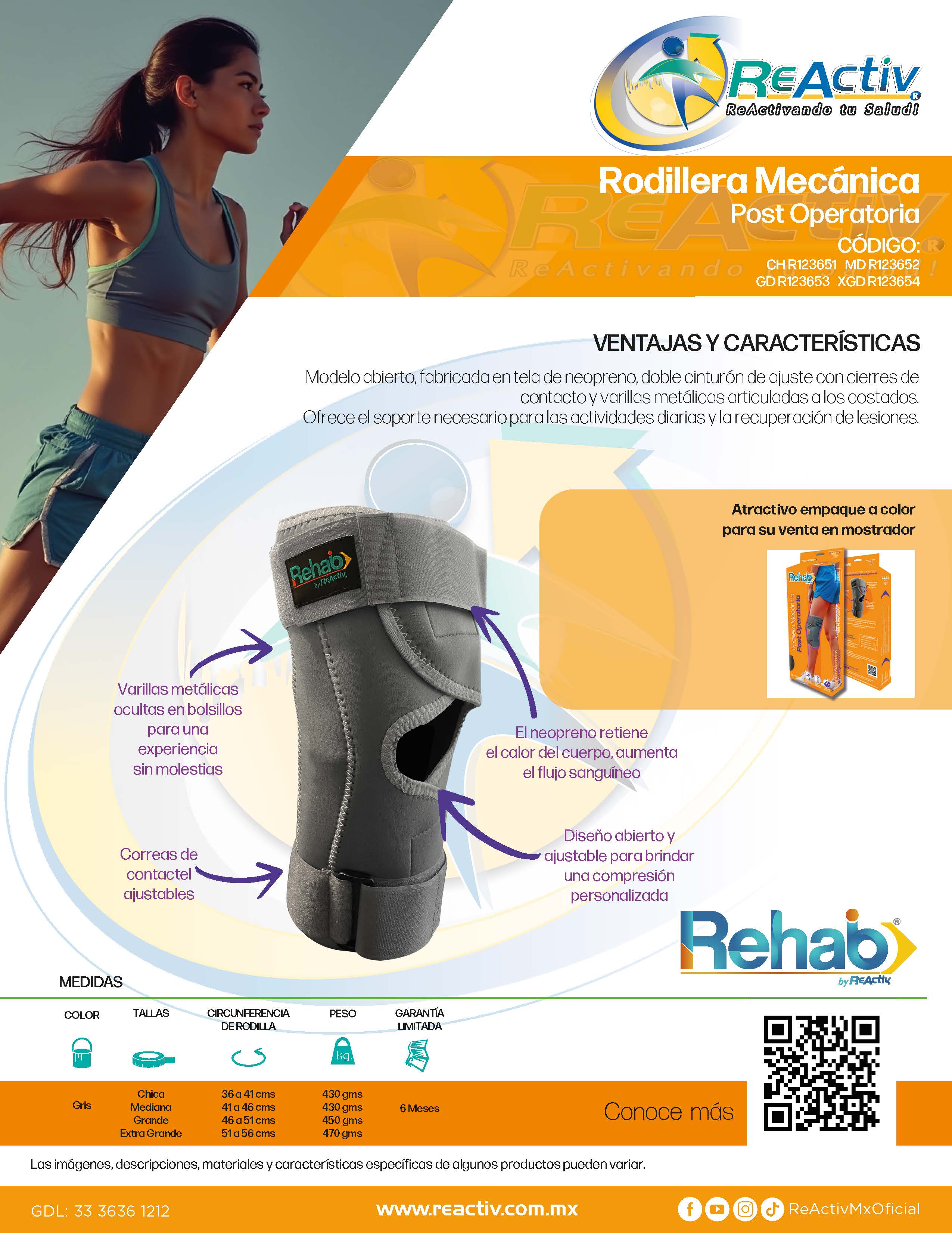 Rodillera Mecánica Post Operatoria de Neopreno con Varillas Metálicas y Broche de Contactel Rehab, Ch