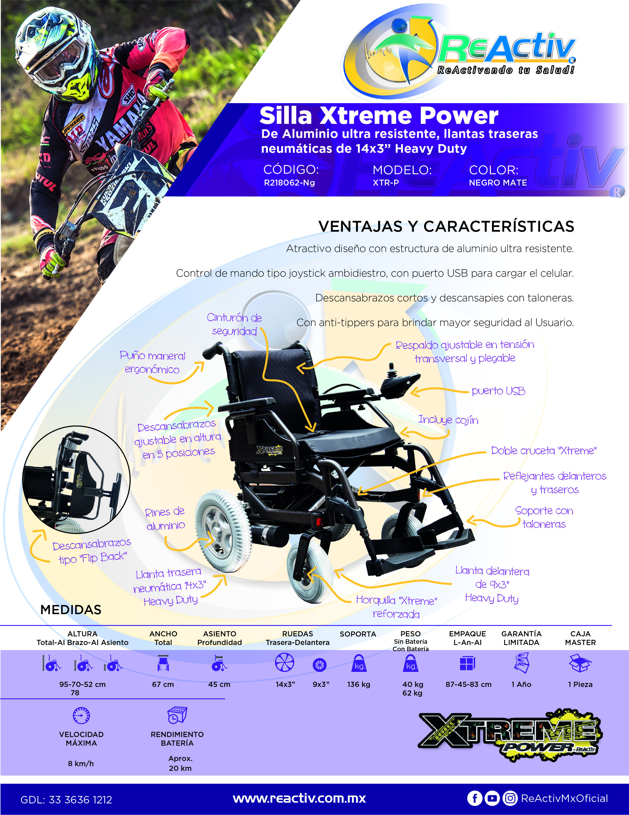 Silla de Ruedas Eléctrica de Aluminio Xtreme Power de 19", Descansabrazos Desmontables Altura Ajustable, Llantas Delanteras de 9" y Traseras de 14" Neumáticas, Antitippers, Asiento y Respaldo Acojinados, Negro Mate