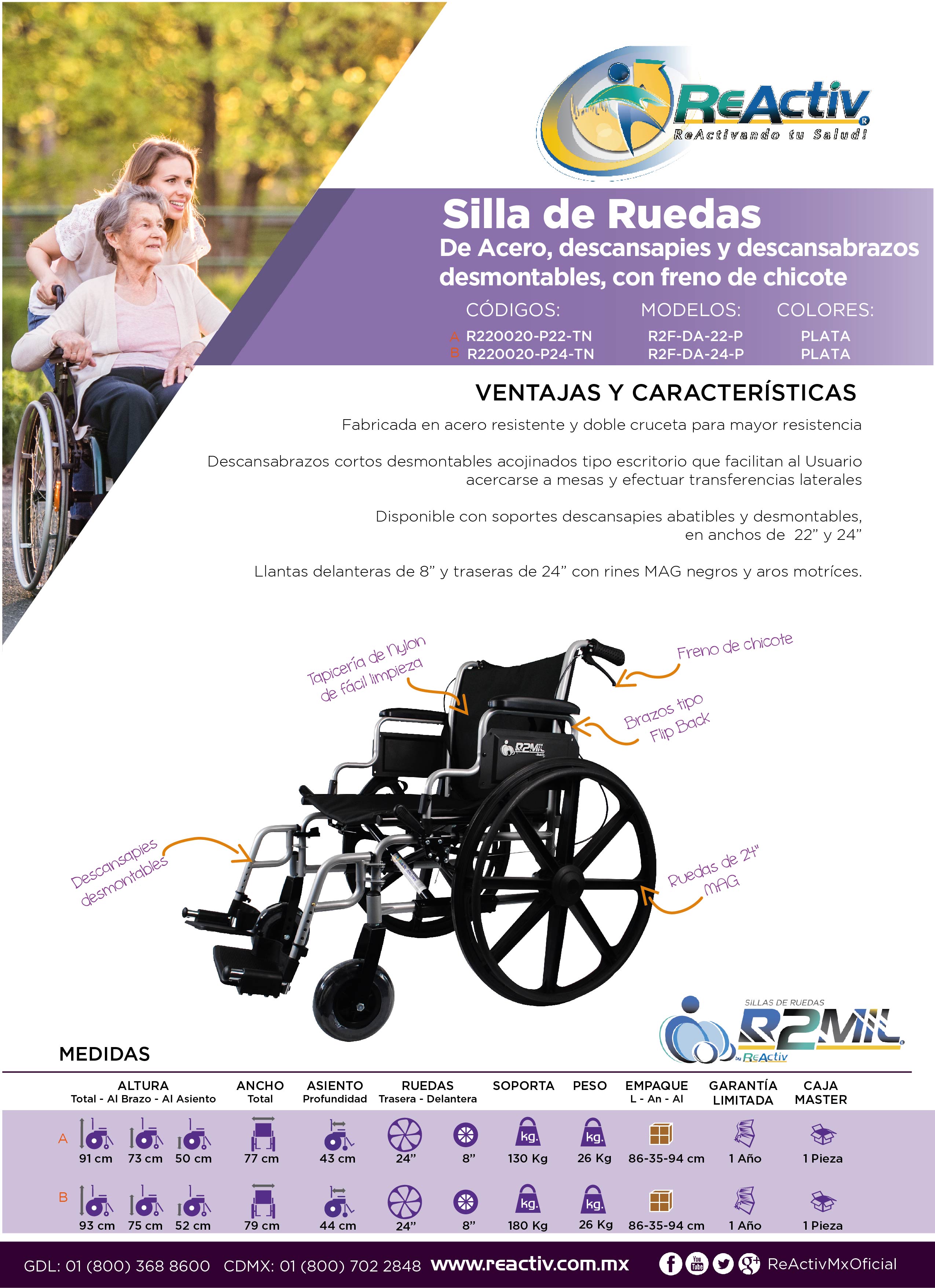Silla de Ruedas R2MIL Forte de Acero Reforzada con Doble Cruceta - Descansapies y Descansabrazos Flip Up - 22 pulgadas - Plata
