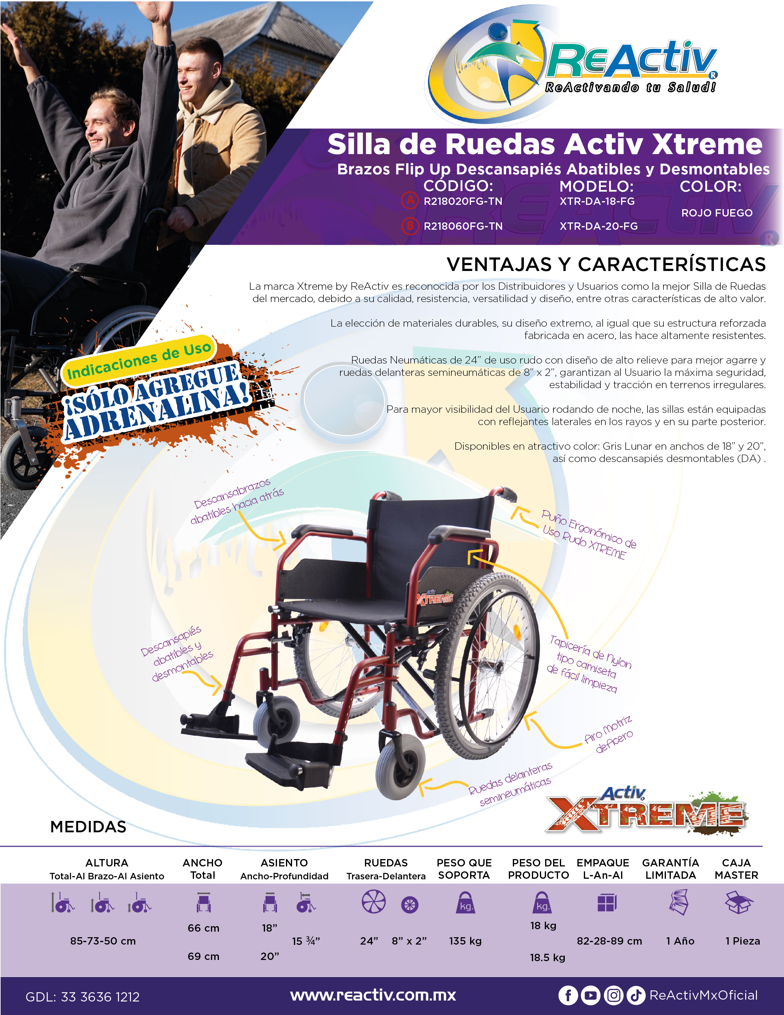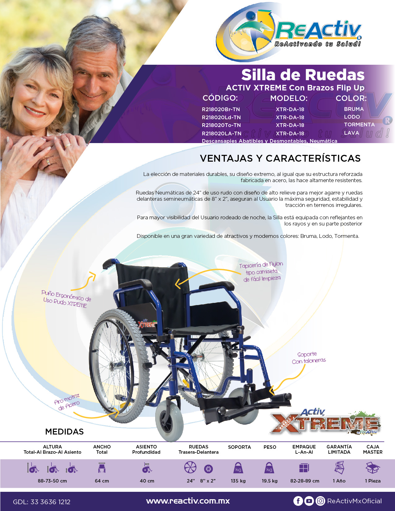 Silla de Ruedas 18" Activ Xtreme, Brazos FlipUp y Descansapies Desmontables /Abatibles, R8x2", Rin Aluminio R24x1.75" Neum, T. Nylon, Bruma