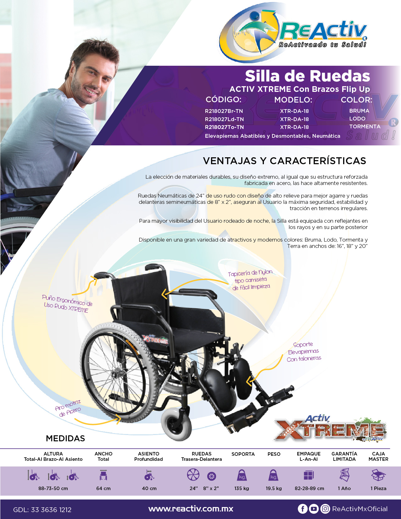 Silla de Ruedas 18" Activ Xtreme,Brazos FlipUp y Elevapiernas Desmontables /Abatibles,R8x2",Rin Aluminio R24x1.75" Neum,T.Nylon,Bruma