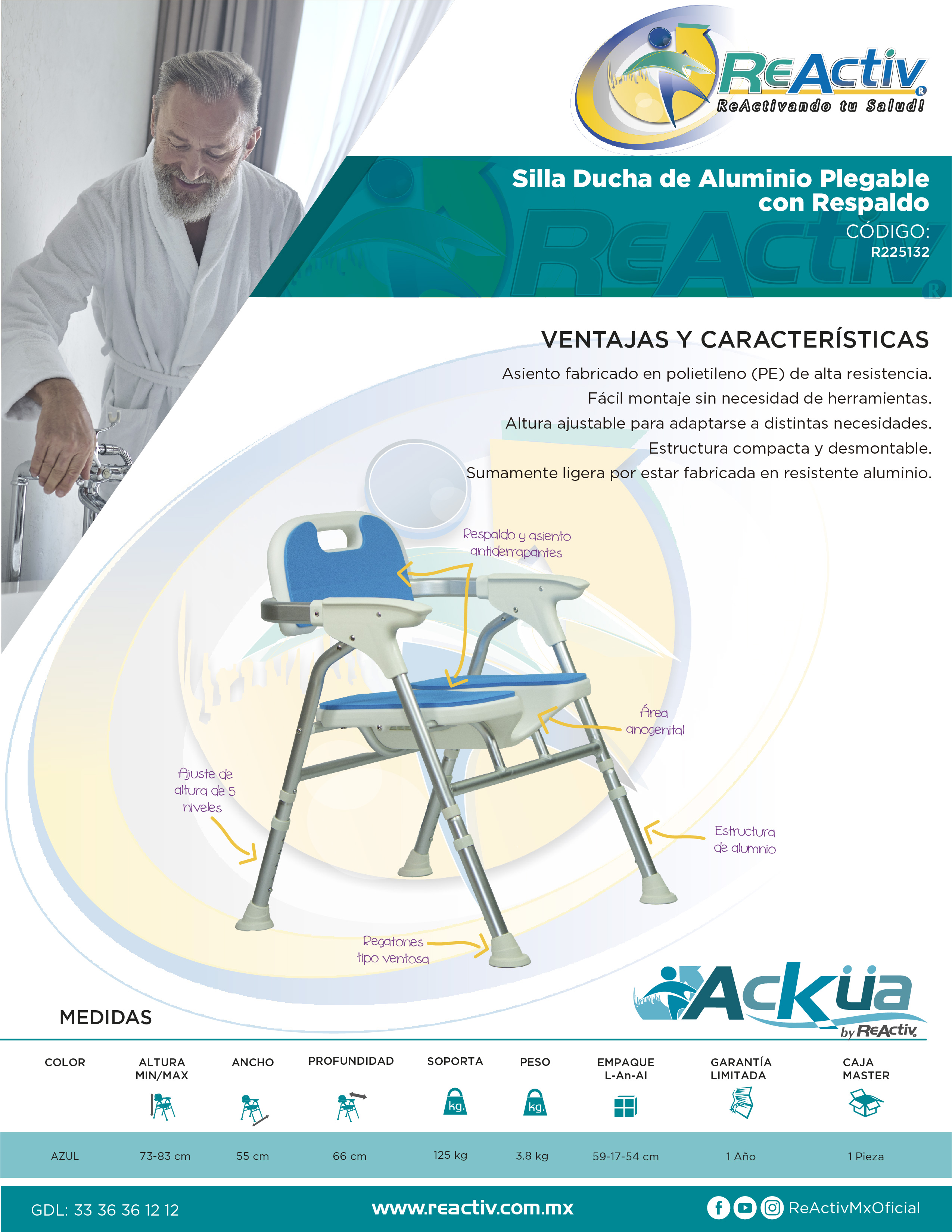 Silla Ducha de Aluminio Plegable con Respaldo y Ergonomía para Aseo Íntimo, Color Azul