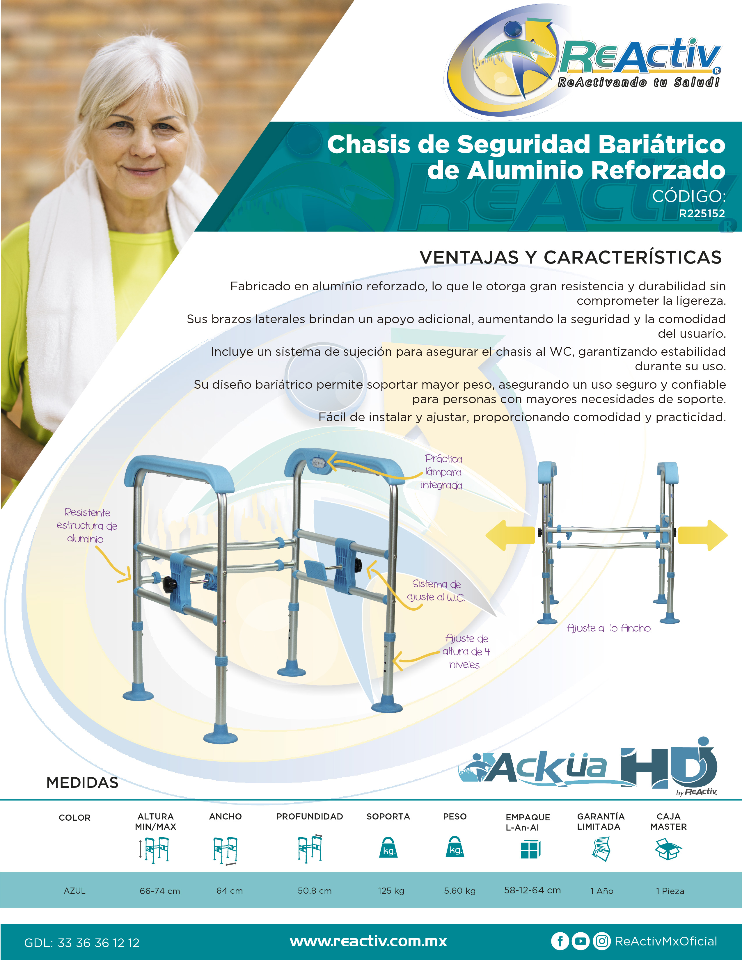 Chasís de Seguridad Bariátrico de Aluminio Reforzado con Brazos, Color Azul