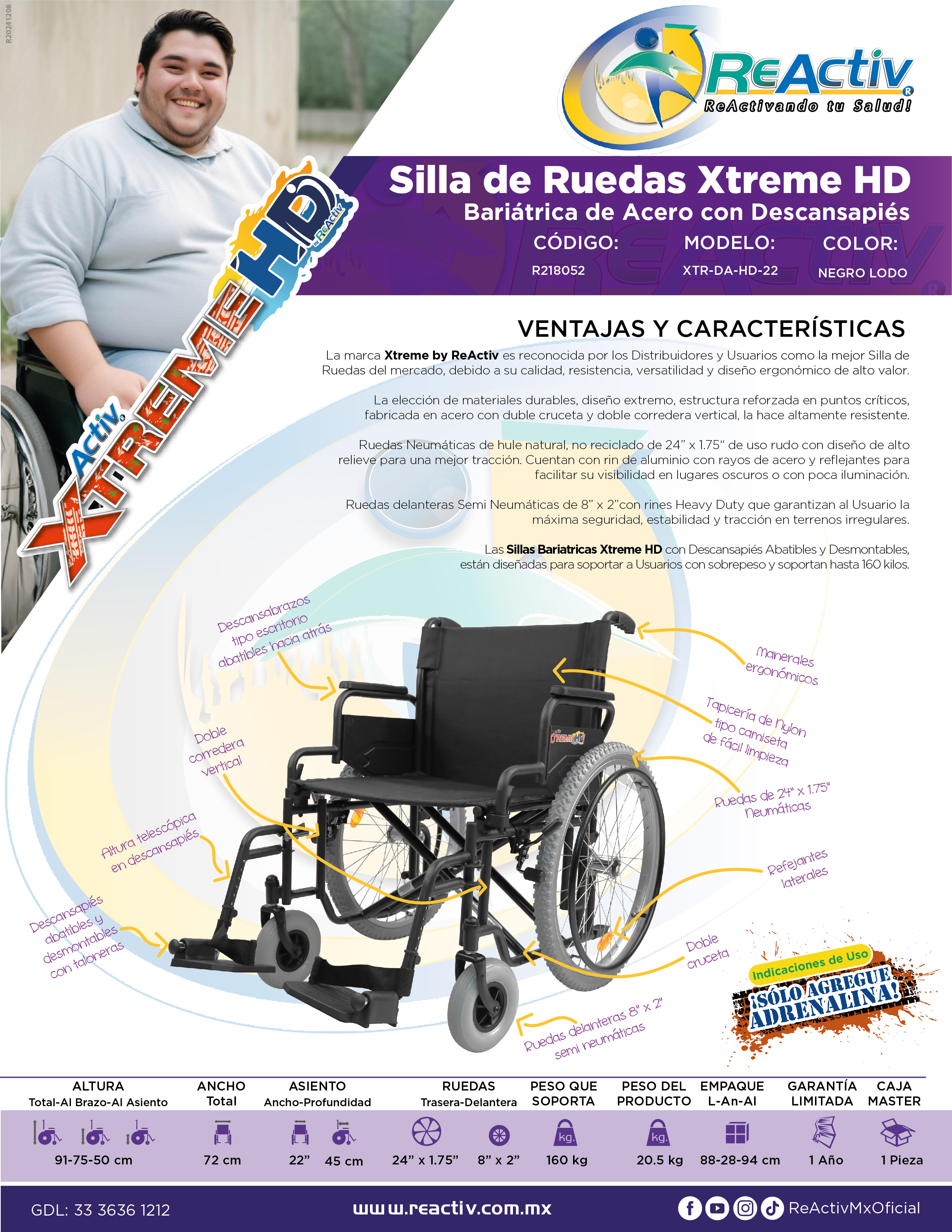 DA 22" Silla de Ruedas Xtreme Bariátrica de Acero con Doble Cruceta, Descansapiés Desmontables, Descansabrazos Abatibles, Ruedas Delanteras de 8x2", Ruedas Traseras Neumáticas de 24", Tapicería de Nylon, Color Negro Lodo